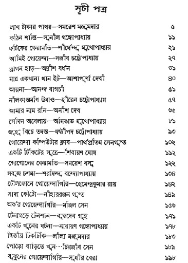 There are twenty-three selected detective stories in this book and all these stories are written by the various prominent Bengali authors, these authors and their stories are-